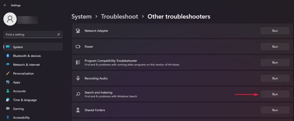 接下来,搜索Search and Indexing,然后单击Run按钮。