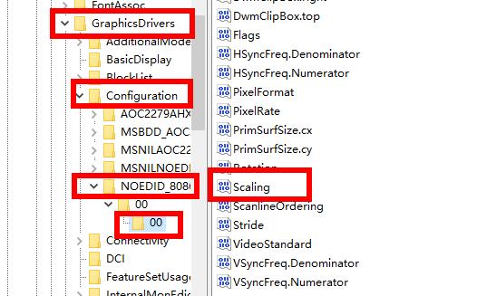 3、在NOEDID..中打开“00”下拉,双击右侧的“scaling”。