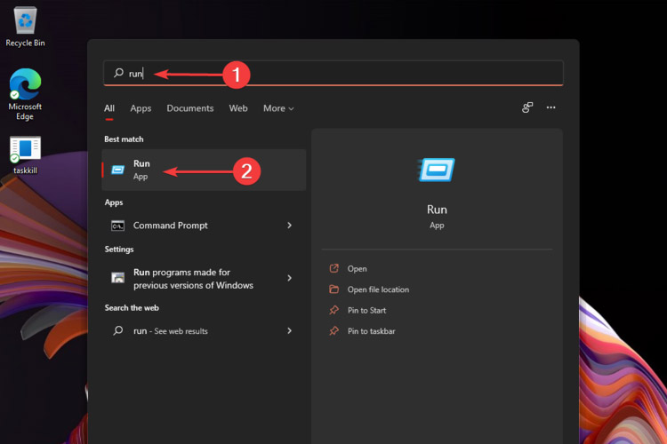 单击“搜索”按钮,然后键入Run并选择它。