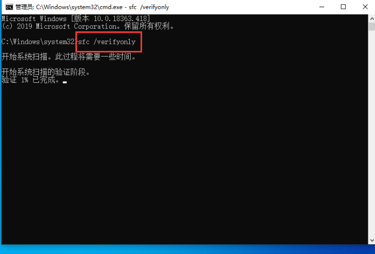 2、进入到命令提示符页面,我们输入命令“ sfc /verifyonly” 可以检查修复系统。