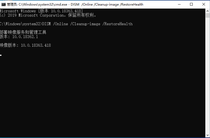 5、最后输入命令“ DISM /Online /Cleanup-image /RestoreHealth”,把系统映像文件中与官方文件不相同的文件还原成官方系统的源文件。
