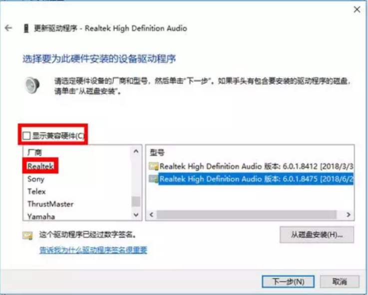 6. 取消【显示兼容硬件】的勾选,在左侧选择【Realtek】 声卡设备,再在右侧选择日期最新的版本,点击下一步安装驱动,安装完成后重启电脑即可。