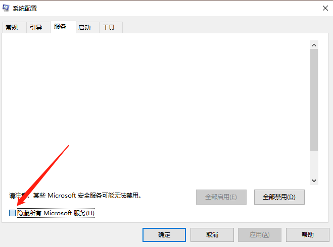 4. 在【服务】选卡界面,一定要勾选【隐藏所有Microsoft服务】,勾选之后其他服务随便你禁用了,对于新手来说这样子是最稳妥的操作,防止系统无法正常开机!