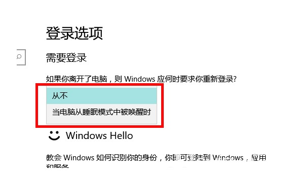 3. 在必须登录选项的下拉列表会出现2个选项,若唤醒时必须输入密码,可选择“当计算机从睡眠模式中被唤醒时”。