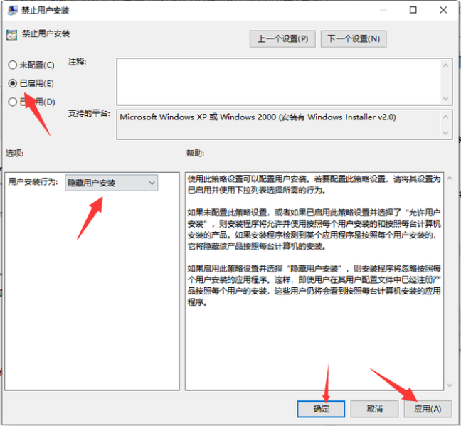 3、选择启用并“隐藏用户安装”,电脑就不会自动下载乱七八糟的软件了。