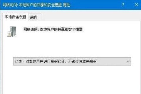 6、在弹出的左侧窗口,点击“本地账户的共享和安全模型”,编辑页面点击“经典-对本地用户进行身份验证,不改变其本来身份”;