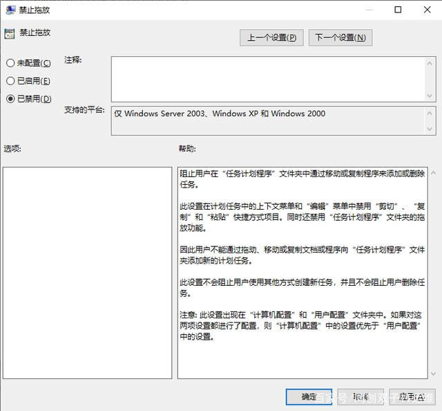 在打开的【禁止拖动】属性对话框中,点击【已禁用】,然后点击确定即可。