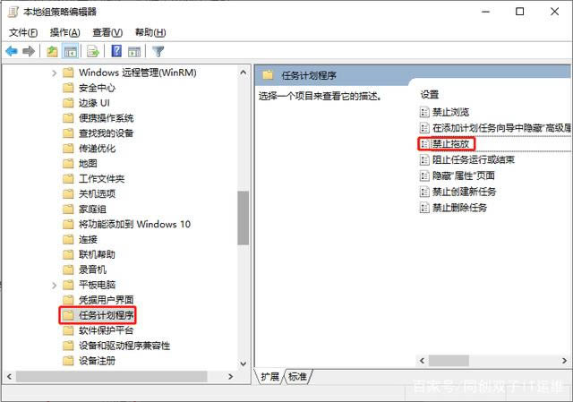 在组策略编辑窗口依次展开,【计算机配置】-【管理模板】-【windows组件】-【任务计划程序】,然后在右侧窗口找到并编辑【禁止拖动】。