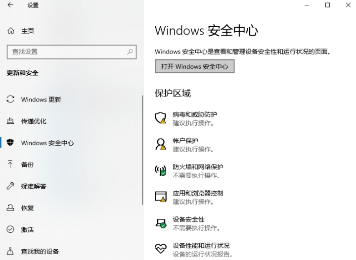 4、然后在右侧找到打开Windows安全中心,