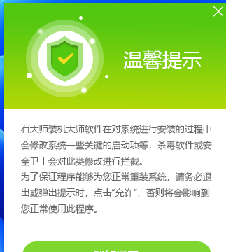打开石大师装机大师,软件将会弹窗提醒使用此软件前请将杀毒软件关闭。