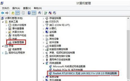 2、再点击“设备管理器”,如看到无线网卡的信息,则说明无线网卡已被正常识别;