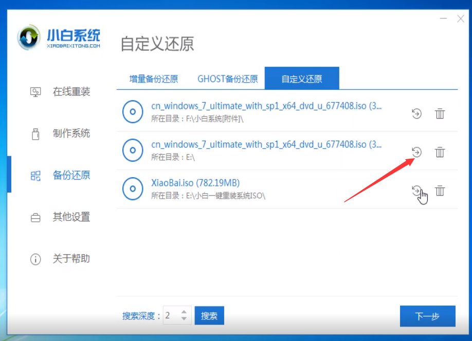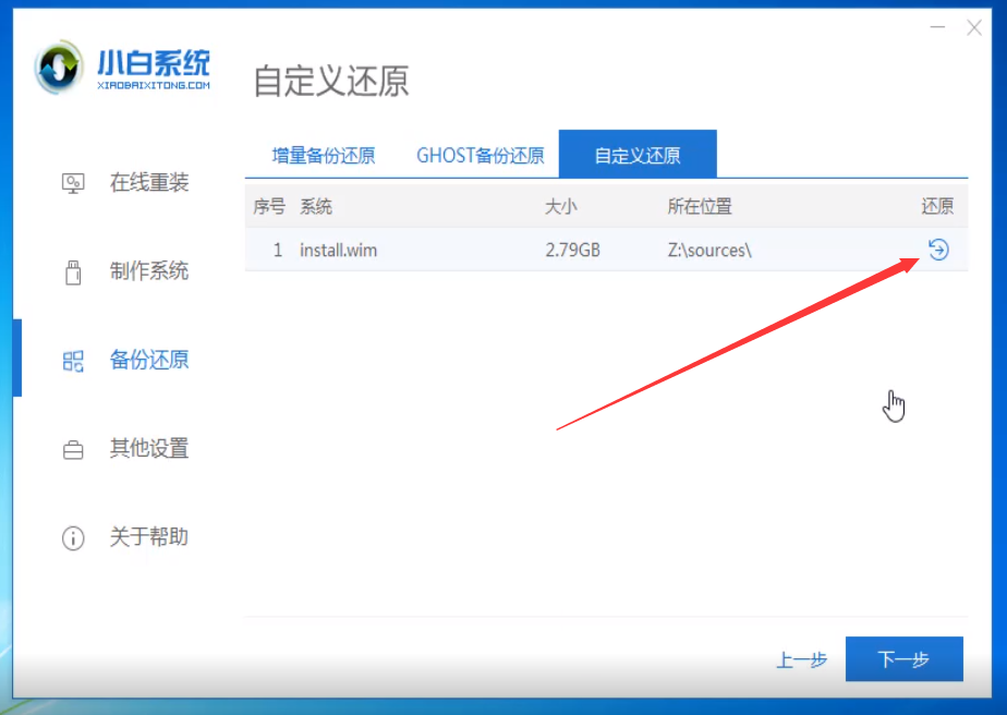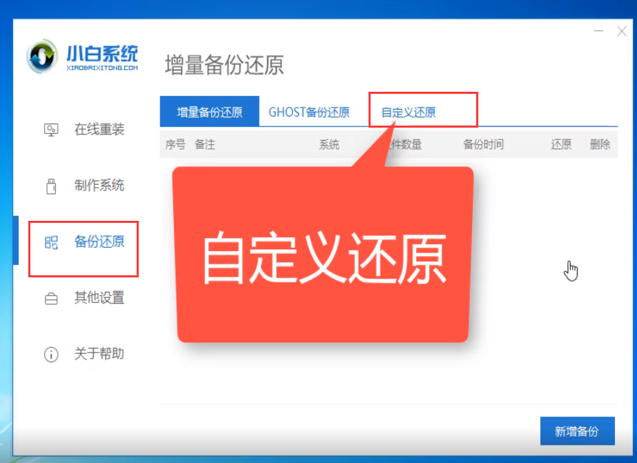 2、检测完成后进入主界面点击备份还原,选择自定义还原