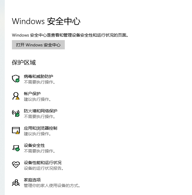 3、在左侧列表中选择Windows 安全中心,在右侧选择打开Windows 安全中心。