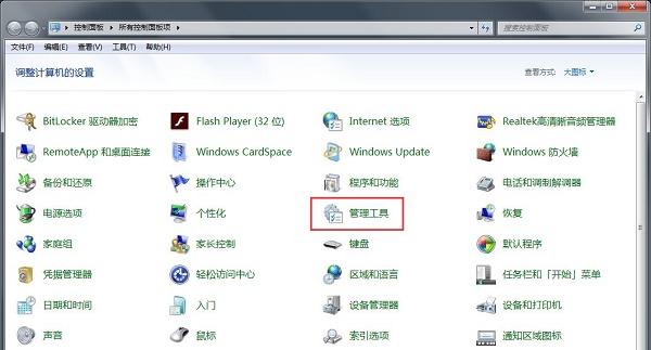 切换为“大图标”,在控制面板中找到“管理工具”选项,并将之打开;