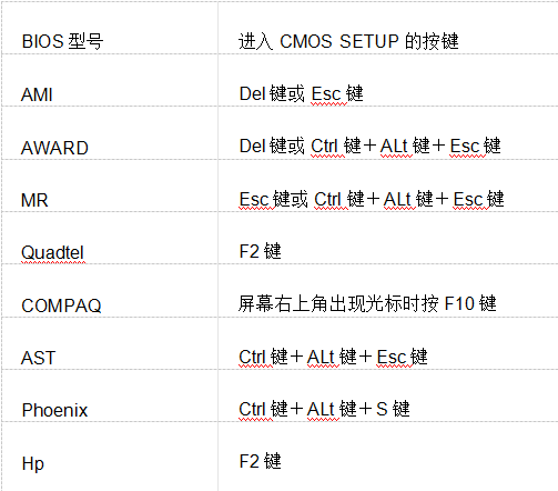 注意:不同类型的电脑进入BIOS设置程序的按键不同,有的机型可以在开机时看到屏幕上给出热键的提示(一般在右下角或左下角),大多数台式机进入BIOS的热键是del键,笔记本是F2键,有的则没有提示。大家亦可参考小编为你准备的各种型号的电脑进入BOIS的热键,具体如下图所示: