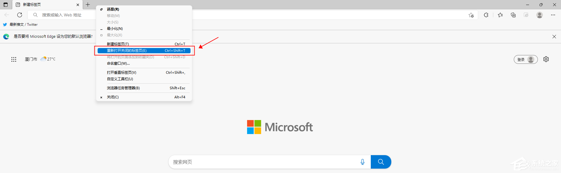 1、右键空白标题栏并点击弹出的下拉菜单中的“重新打开关闭的标签页”即可恢复刚才关闭的标签页。