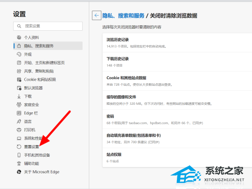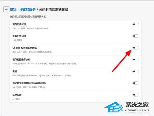 在隐私中点击选择每次关闭浏览器时要清除的内容。
