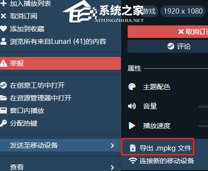 4、等待系统显示匹配成功,打开Wallpaper Engine电脑端、右键单击目标壁纸、选择“发送至移动设备”,点击“导出文件”选项,将会生成一个后缀为“mpkg”的壁纸文件保存在本。