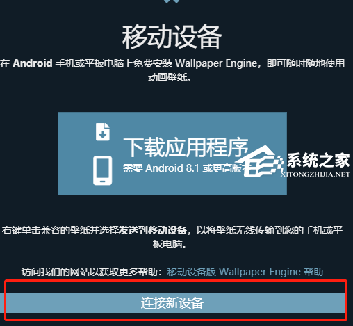 2、确保手机和电脑连接在同一WIFI下,打开PC端Wallpaper Engine,点击右上方 “ 移动设备 ” 图标,然后点击“连接新设备”,然后会生产一个PIN。