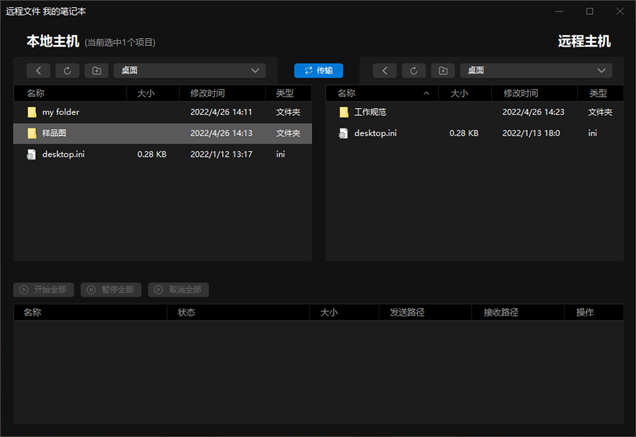 独立【远程文件】功能支持主被双方设备互传文件,连接成功后,默认打开本地与远程计算机的桌面目录。