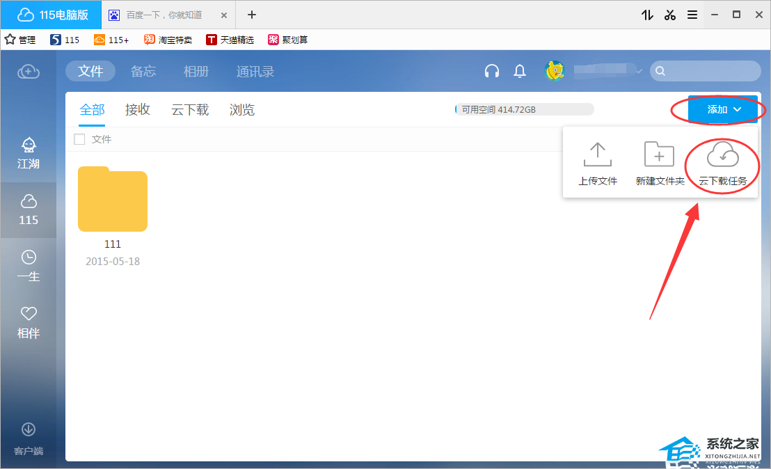 4、之后在右上角的位置就可以看到"添加"按钮了,点击"添加"后在弹出的选项中选择"云下载任务"。