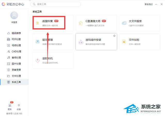 2、打开软件进入首页,在最左边的底部找到 “系统工具”,然后选择 “数据恢复 ”的操作方法和之前的方法一样,点击选择扫描磁盘中删除的原始文件,等待文件扫描完成后选择需要恢复的文件即可。