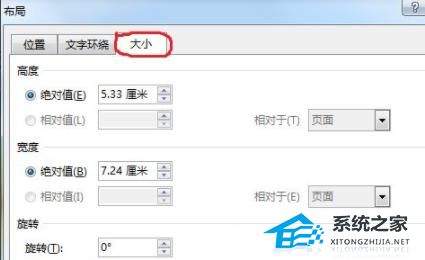 3、此时会出现“布局”设置窗口,点击大小设置模块。