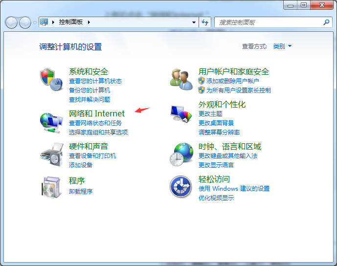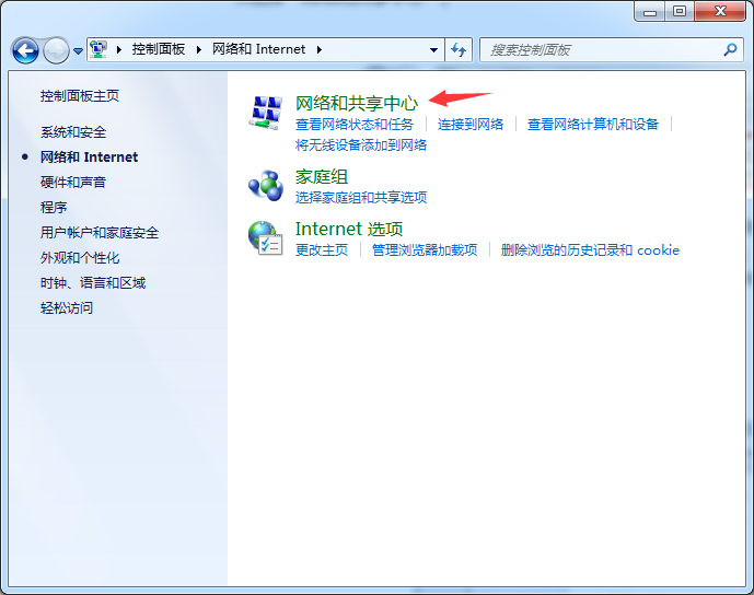2、在控制面板中打开网络和 Internet。