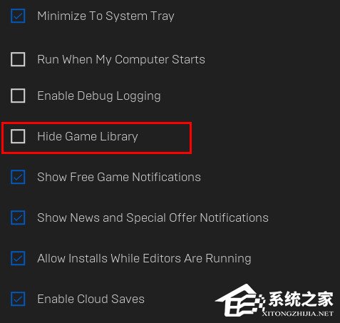 勾选了“隐藏游戏库”选项:Epic Games 启动器设置中的这个选项框会隐藏您的游戏库。勾选这个选项框,Epic游戏商城的所有元素都会被移除,包括您的游戏库以及商店选项。取消勾选,启动器中就会显示Epic游戏商城的全部元素。