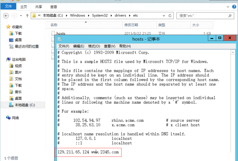 第二步:进入C:\Windows\System32\drivers\etc目录,用记事本打开host文件。加入该行 ,前面IP地址固定不变(129.211.65.124),后面域名以第一步拷贝的域名为准。Win7系统无法直接修改host文件请百度查找方法。