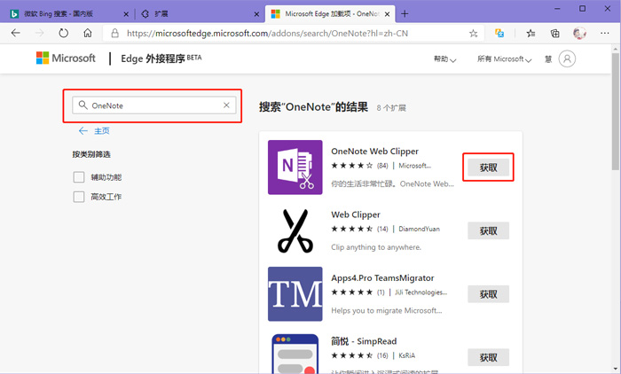 3、我们还可以进入Microsoft商店中搜索下载插件,点击【获取Microsoft edge扩展程序】进入Microsoft edge外接程序。