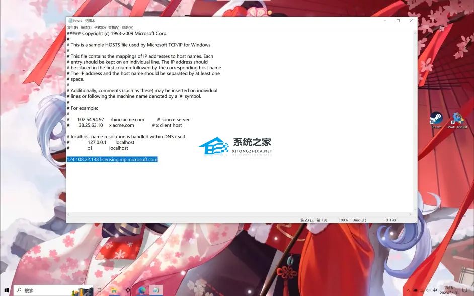 第四步,按照上面图片在文档最后加上124.108.22.138 licensing.mp.microsoft.com