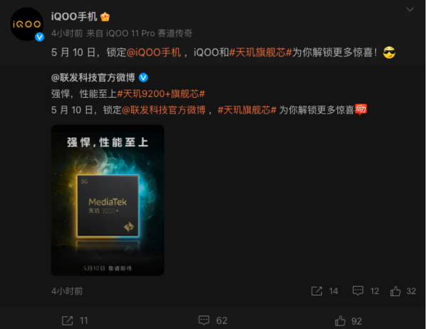 【本站】5月5日消息,联发科技官方今日宣布,将于5月10日正式发布旗舰芯片天玑9200+。消息称,iQOO Neo系列的首款"Pro"产品iQOO Neo8 Pro,将会是首个搭载该芯片的手机。