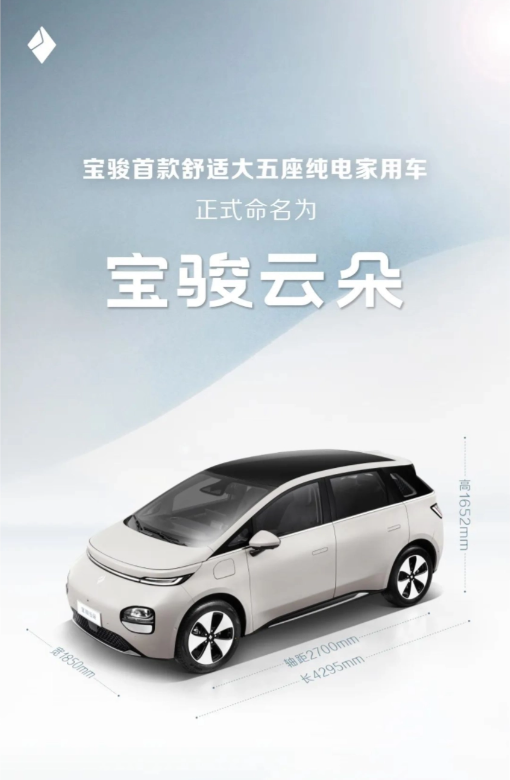 【本站】5月10日消息,五菱宝骏官方微信公众号发布消息称,其推出的首款大型五座纯电家用车——宝骏云朵正式亮相。