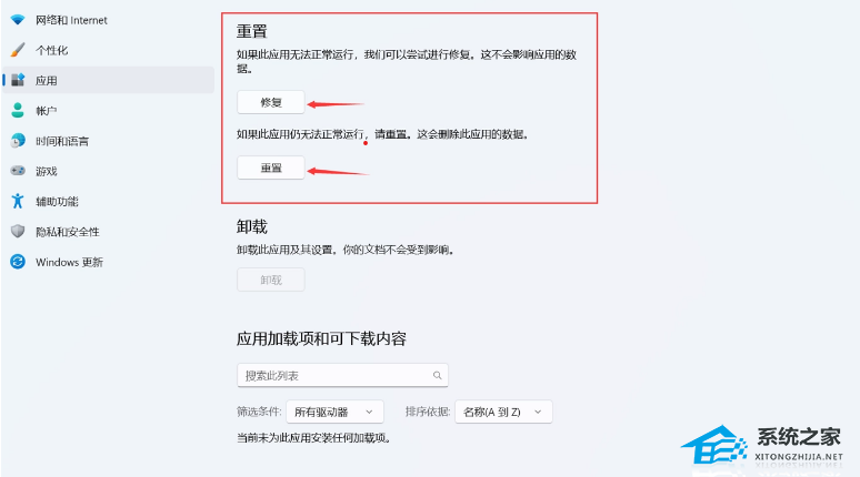 4、在“重置”区域中,可以先选择“修复”,如果依然无法修复的话可以点击“重置”。