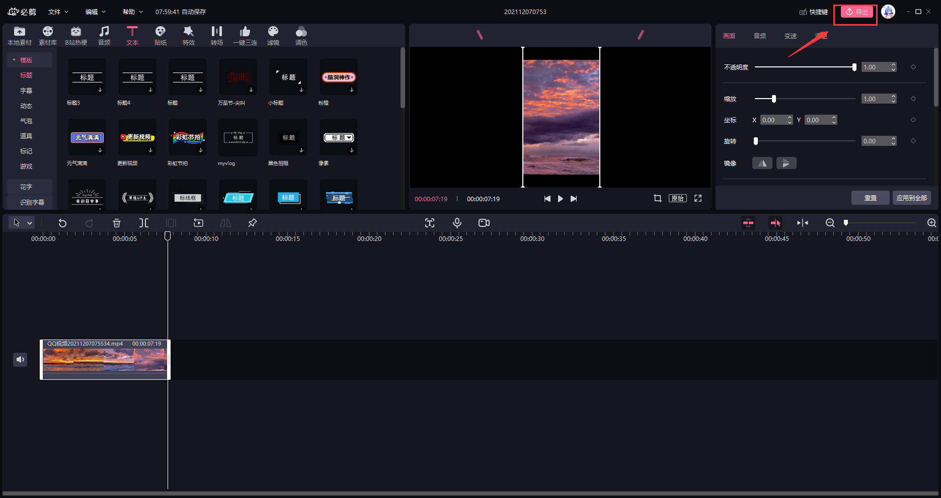 首先,当我们制作完成视频之后,点击右上角的导出。