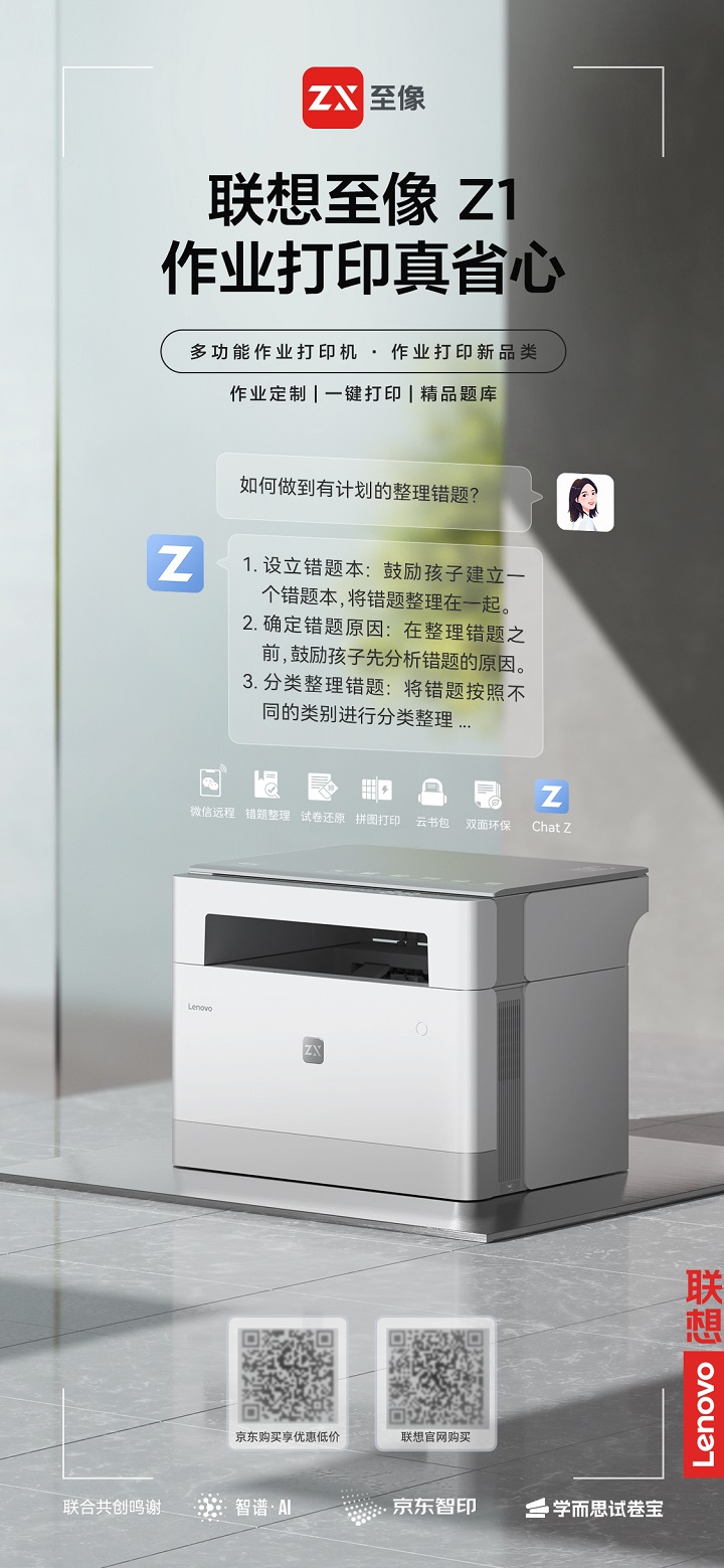 基于技术整合和市场洞察,联想至像推出的Z1作业打印机让人眼前一亮。这个作业打印新物种,拥有Chat Z智能练习AI助手和百万海量试卷题库,有“云书包”功能,支持分类收纳、远程打印,更有错题整理、试卷还原、一键拼图等功能,覆盖了家庭作业辅导的全场景。
