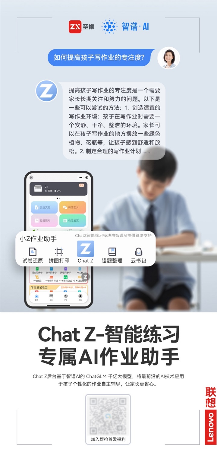 其中最亮眼的就是Chat Z,它是联想至像Z1携手智谱AI联合打造的智能练习专属AI作业助手,其后台基于智谱Al的 ChatGLM 千亿大模型。
