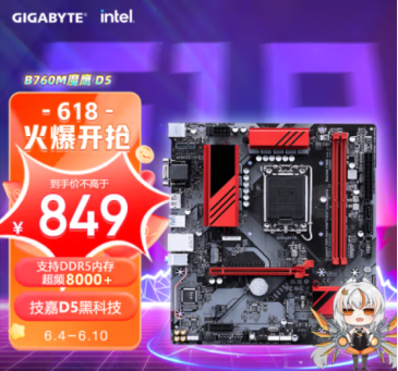 想要一键触达DDR5 8000MHz又想省钱买主板?技嘉B760M魔鹰主板一定不要错过。作为技嘉为十三代酷睿打造的入门级DDR5主板之一,618年中钜惠活动期间仅需849元可叠加优惠,性价比爆表!并且这款主板同样支持D5内存黑科技提供双M.2插槽和USB3.2接口以及3个视频输出接口(DP、HDMI、DVI),并另外单独有WIFI蓝牙版本可选。功能齐全又不贵,内存超频很给力,技嘉B760M魔鹰可谓麻雀虽小五脏俱全,强烈推荐。购买链接:http://item.jd.com/100045464202.html#crumb-wrap