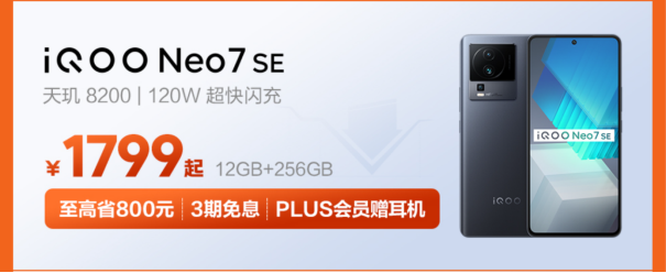 iQOO Neo7 SE作为游戏性能出众的中端机,迎来了至高直降800元的优惠,支持3期免息分期,学生购机则至高优惠810元,还能赠送移动电源,前往直播间下单也有限量耳机赠送。其中12+256GB版本(星际黑)参与补贴后更是仅需1799元。