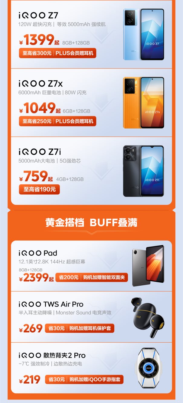 更贴心的是,主打长续航、高效快充的千元机也纷纷参与到618京东狂欢中。iQOO Z7至高省300元,1399元起;iQOO Z7x至高省250元,1049元起;iQOO Z7i至高省190元,759元起。另外,iQOO Pad、iQOO TWS Air Pro、iQOO 散热背夹2 Pro等设备也有直降优惠,同时赠送配套的数码好物。