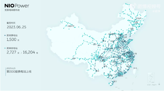 【本站】6月25日消息,蔚来汽车今日宣布,其全国范围内的换电站数量已突破1500座,累计建成16204根充电桩。蔚来还计划在2023年新增1000座换电站,预计年底将超过2300座。