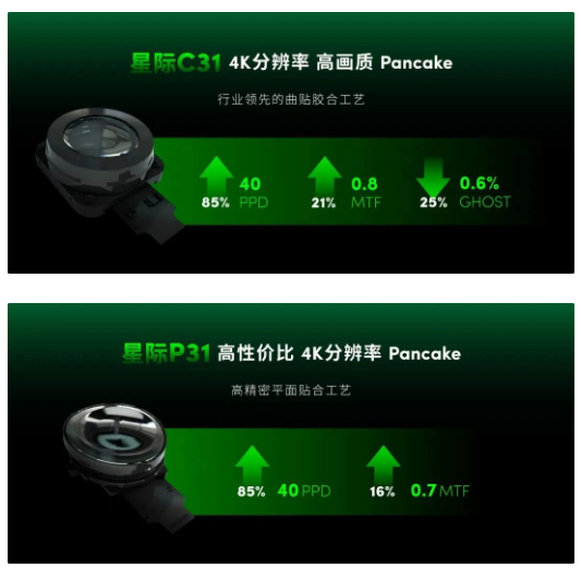 在本次峰会上,歌尔光学推出了两款新产品:星际C31和星际P31 VR Pancake显示模组。其中,星际C31采用了2片式镜片设计和曲贴胶合技术,相比主流LCD Pancake模组,在保持95°FOV的前提下,PPD(像素密度)提高了85%,MTF(清晰度)提升了20%,杂散光降低了25%。这款模组适配了4K Micro-OLED屏幕,使显示效果更加细腻清晰。另一款产品星际P31则采用了3片式镜片方案和成熟的平面贴膜技术,MTF提升了15%,FOV达到了95°,同样可适配4K Micro-OLED屏幕。这两款VR Pancake显示模组在视频会议、商务办公、影音娱乐等多种场景下均能表现出色。