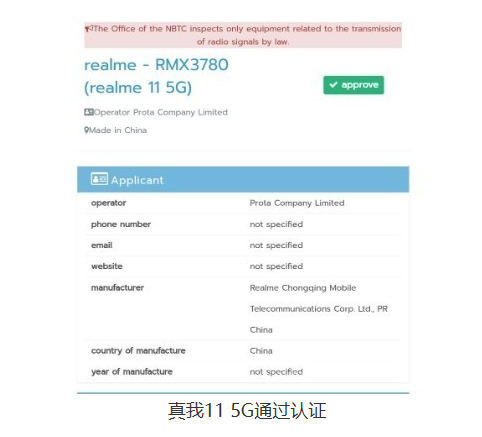 【本站】7月31日消息,据外媒报道,真我(realme)公司的最新款手机真我11 5G已获得泰国NBTC和印度BIS认证,预计将面向全球市场推出。