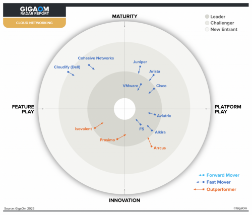 在《GigaOm 2023年云观察能力解决方案雷达报告》中,F5处于领导者象限的快速发展者位置。该报告高度评价了F5的云和应用观测能力,F5凭借夯实的技术根基,在报告中定义的大多数指标中排名很高,提供了适合所有架构模型的多云网络解决方案。