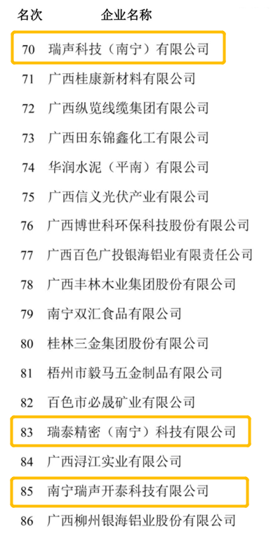 据悉,该榜单是以2022年营业收入为入围标准,经专家委员会审定后评选而出的制造领域100强企业。其中,瑞声科技(南宁)有限公司位列榜单第70名,瑞泰精密(南宁)科技有限公司较去年上升16位至第83名,南宁瑞声开泰科技有限公司则是首次入选百强榜单,位列第85名。