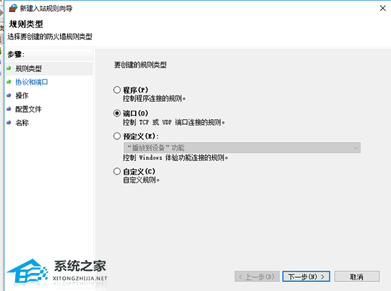 4、在窗口中点击左侧的“规则类型”,将“端口”勾选上,点击下一步。