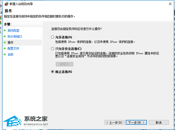 6、最后在“操作”界面中,将“阻止连接”勾选上,点击下一步完成相关设置即可。