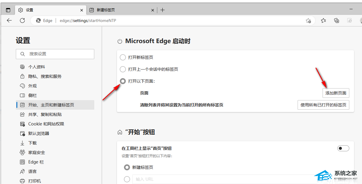 2. 进入到设置页面,在该页面的左侧点击【开始、主页和新建标签页】,然后在右侧勾选【打开以下页面】,然后点击【添加新页面】。
