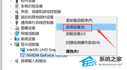 4、选中nvidia卡,右击选择“启用设备”。